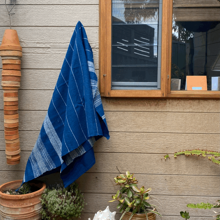 Hand woven from 100 % hand spun cotton and natural dyes sourced from the earth. Made by Village Weavers in Laos. Machine washable, cold water preferred.
