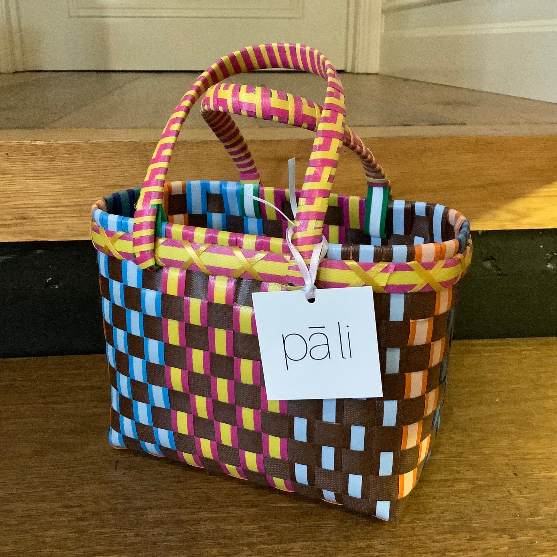 Each Pāli basket is individually handwoven in a remote village in Myanmar, from new pallet strapping made from recycled plastics. Plastics are collected by locals from streets and beaches, recycled into pellets, then made into rolls of new strapping.
