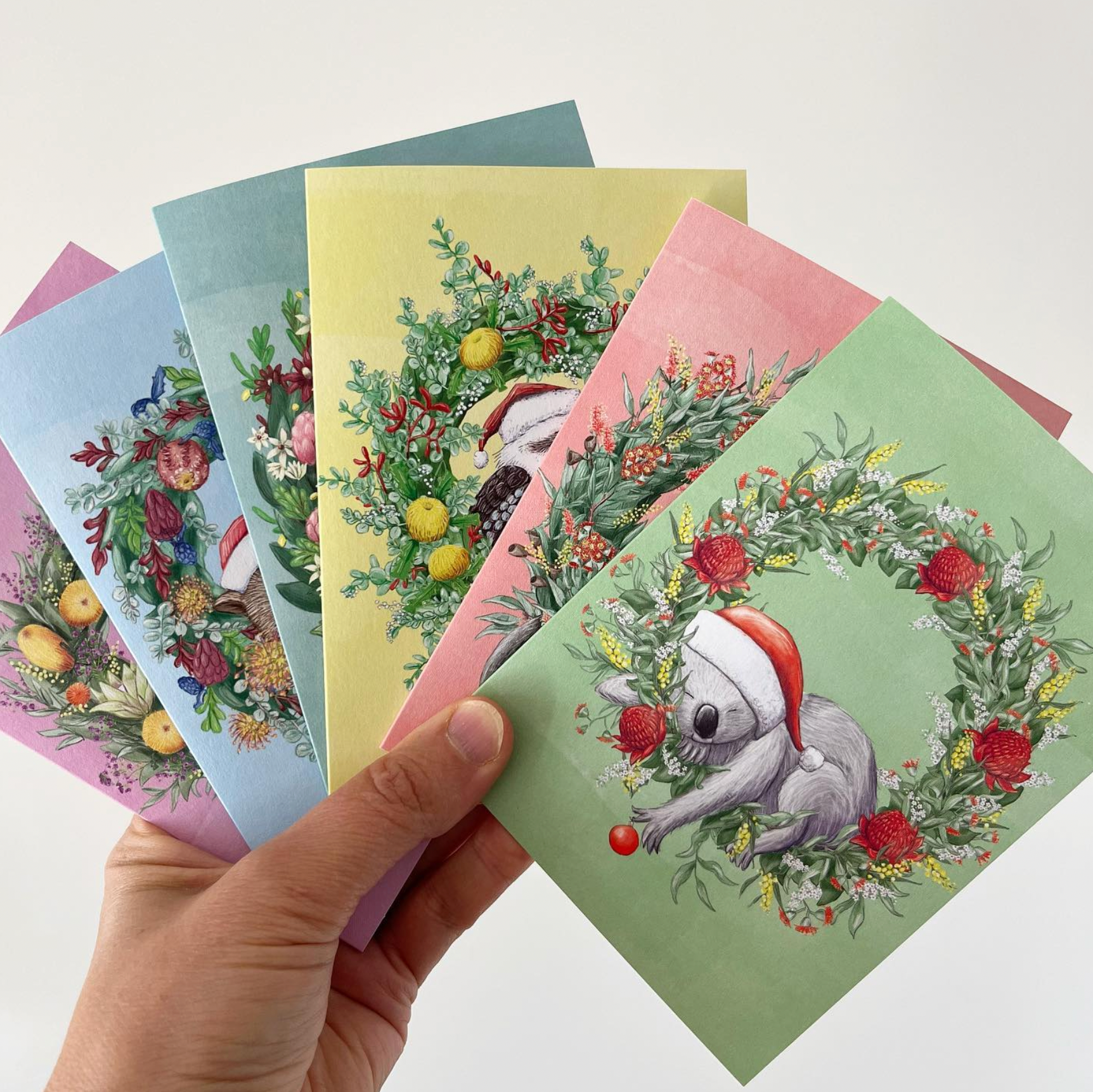 These sets of six holiday cards feature koala, wombat, cockatoo, kookaburra, platypus and kangaroo.